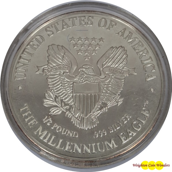 This SOLID SILVER USA 1/2ib ROUND contains 1/2ib (8oz) of .999 fine Silver.